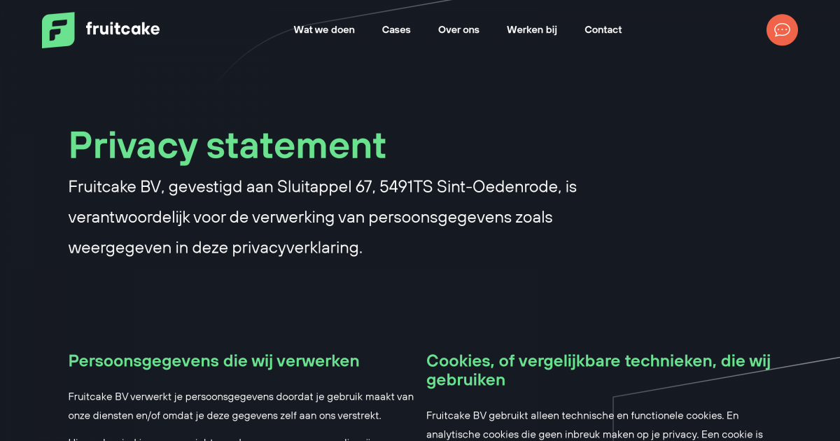Fruitcake BV, gevestigd aan Sluitappel 67, 5491TS Sint-Oedenrode, is verantwoordelijk voor de verwerking van persoonsgegevens zoals weergegeven in deze privacyverklaring.