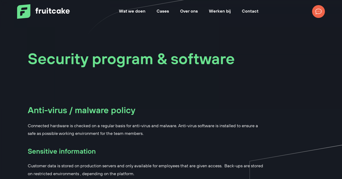 For Laravel projects, a local development server (either a server located inside the office, or a server running on a Fruitcake issued computer) will be used. This will prevent unauthorized access or data loss from any possible break-in. Sensitive data will only be available in the online test- and production environment, never on the (local) development environment.